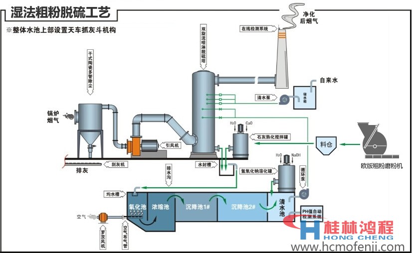 桂林鴻程制造脫硫磨粉機的兩大機型:HC1700縱擺磨粉機(歐版磨粉機、雷蒙磨粉機)濕法脫硫工藝;HLM立式磨粉機干法脫硫工藝。